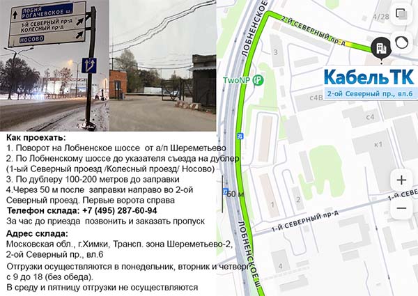 Склад кабельной продукцииМосковская обл., г.Химки, 2-ой Северный пр., вл.6 Тел: +7 (495) 287-60-94 |